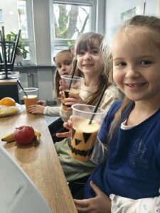 Klasa 1b wykonała dziś w sali kulinarnej halloweenowy koktajl owocowy. Każdy dbał o to żeby uzyskać jak najbardziej pomarańczowy odcień.Dobra ...